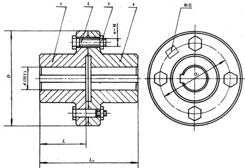 許用轉(zhuǎn)速[n]r/min | 軸孔直徑d(H7) | 軸孔長度L | D | D1 | 螺栓 | L0 |